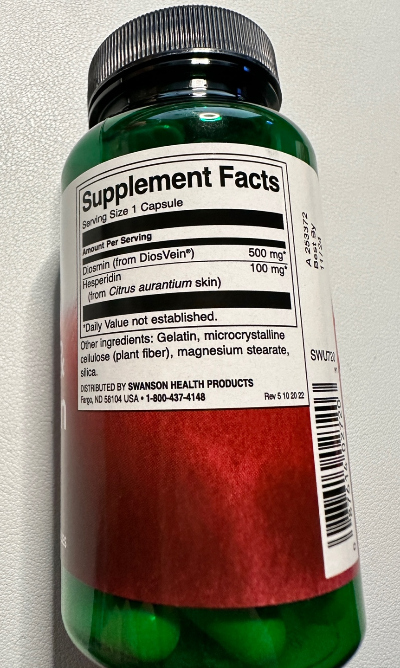 스완슨 회사의 제품은 디오스민과 헤스페리딘 성분이 주 성분으로 각각 500mg과 100mg이 들어가 있다. 둘 다 혈관질환에 도움이 되는 제품이다. 나의 경우 병원에도 내방했고 어느 정도 개선되면 몇 개로 먹으라는 답변을 들었지만, 만약 병원을 내방하지 않는다면 하루 최대함량까지만 먹고 최소한을 유지하는 것이 맞다. 체형이나 체질이 다르기 때문에 직구약품에 대해서 용량을 잘 지켜야 한다. 나는 치센기준으로 먹고 있고, 이 제품은 하루 1알 이상 먹지 않고 있다.