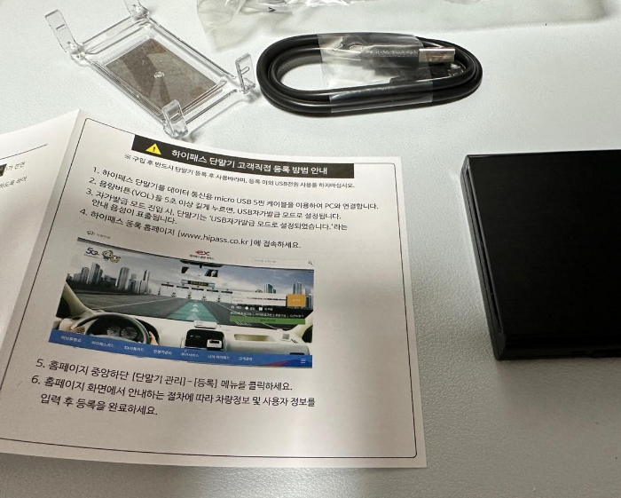 단말기는 구성품에 있는 잭을 연결해서 컴퓨터를 통해 등록을 해야 한다. http://www.hipass.co.kr에서 등록해야 한다. 홈페이지에 단말기 관리->등록에서 절차에 따라 사용자 정보를 입력하면 되어서 처음사용하는 나도 등록에 어려움은 없었다. 이후에 기기에 하이패스 카드를 넣고 차량에 비치 또는 부착하여 사용하면 된다.