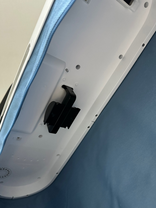 의류관리기는 접힌몸통을 열면 위와 같이 늘어나며, 재질은 튼튼한 면소재 느낌이었다. 전면부는 출입구와 조작버튼이 있고 후면부에는 전원부만 있다.