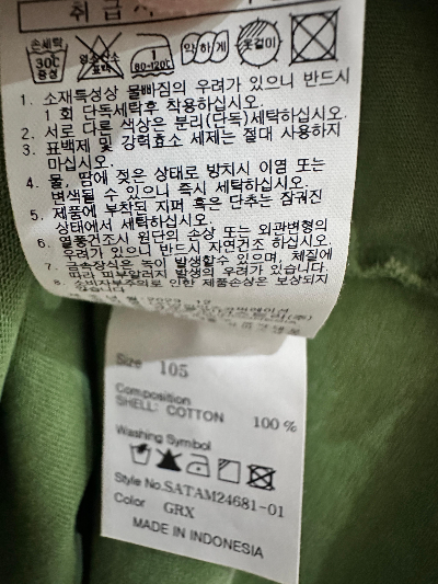 제품은 면 100%이고, 손세탁을 권유하고 있다.