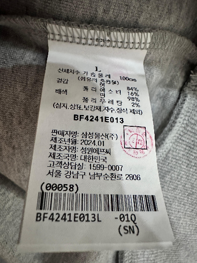 출고가격은 159,000원이고 제품번호는 BF4241E013이다. 넥라인은 엄청 딴딴하지는 않고 깔끔하게만 처리되어있다. 입고 벗기는 편하다.