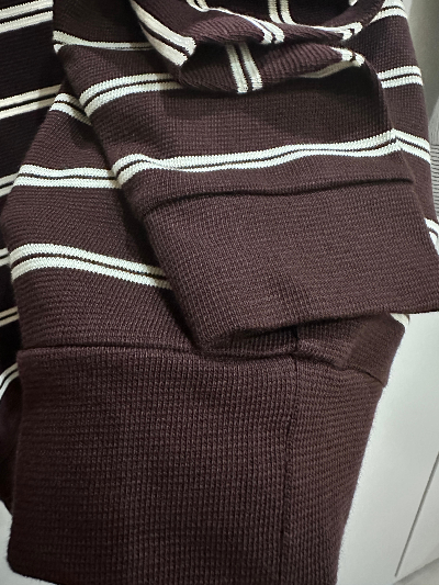 25년 10월 가을이다. 간절기에 아침저녁과 낮의 기온차이가 심해지 다 보니까 적당한 단품아이템이 필요했다. 니트는 살짝 두텁고 티셔츠 등은 얇다. 맨투맨이나 카디건의 경우는 이미 활용하고 있지만 선택지를 넓혀보고 싶어서 백화점에 방문을 했고, 니트라이크 티셔츠를 발견했다. 처음에는 티셔츠로 보였는데 소재는 티셔츠이고 디자인이나 질감은 니트의 느낌을 가지고 있어서 몇 해 전부터 니트라이크 티셔츠를 제법 구입해 왔었다. 이번에는 스트라이프 디자인이라서 활용에 한계점은 있어 보였으나 몇 가지 포인트가 좋았고, 색감과 두께감이 딱 알맞아서 바로 구입을 해봤다.
