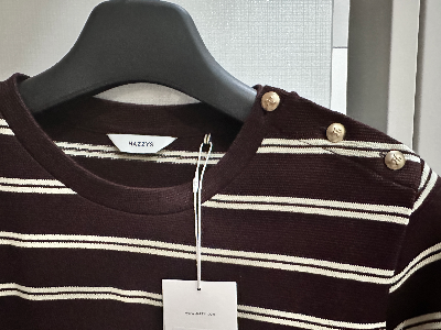 전반적으로 스트라이프와 좌측어깨에 금장포인트가 있는 기본 티셔츠이다. 스트라이프의 간격이나 배열도 균형이 있어서 착장시 안정감을 주는 느낌이다. 색상은 브라운중에서도 짙은 브라운색상이고 줄무늬가 흰색이라 대조되면서 단정해 보이는 효과도 있다.