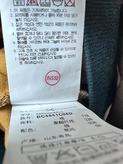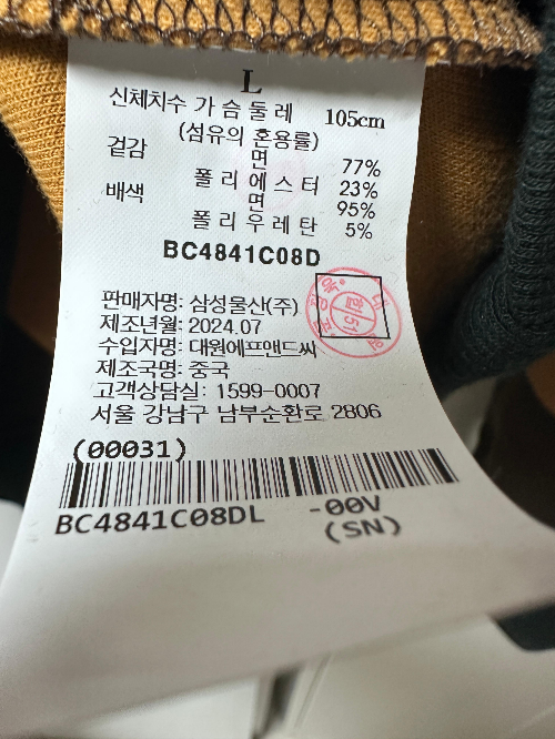 제품번호는 BC4841C08D이며, 출고가격은 199,000원이다. 면혼방제품이고, 24FW제품으로 보인다. 기계세탁은 가능하다. 세탁할 때 망에 넣어서 세 번 세탁했는데 큰 변형 없었다.