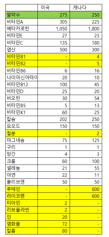 위 표는 내가 번역해가면서 성분을 비교해 본 것이다. 9가지의 성분이 차이가 있었다. 같은 브랜드여도 국가별로 허가되는 품목이 달라서인지 구성성분이 달랐다. 비타민B의 경우 미국산이 많았고(2배 이상) 반대로 마그네슘이나 크롬은 캐나다산이 더 많았다. 구성성분과 비율이 다르기 때문에 몇 번씩 먹어보면서 맞는 제품을 찾아가는 것도 좋을 것 같다. 사실 가격차이는 5천 원 정도 발생했지만 이런 부분 때문에도 구입을 해보고 싶었다.