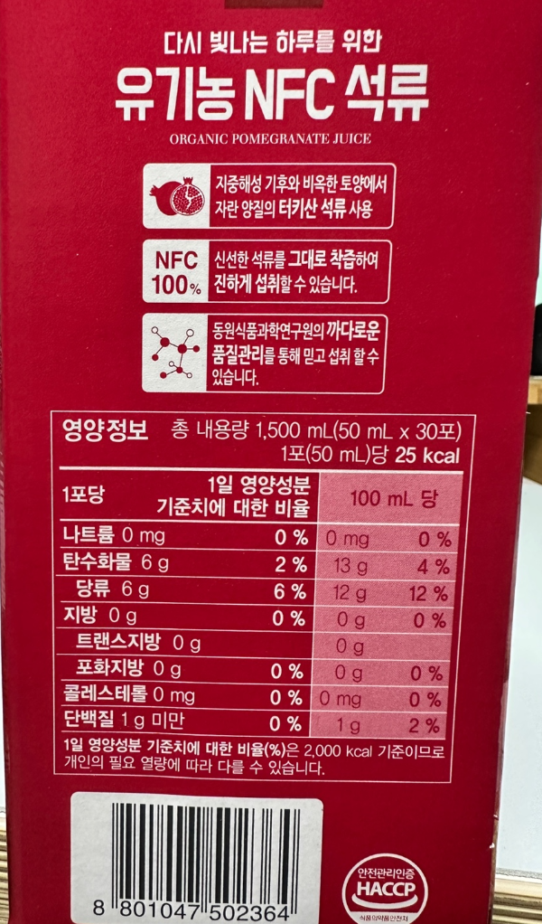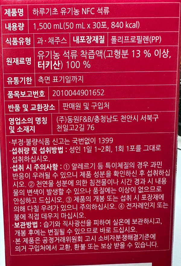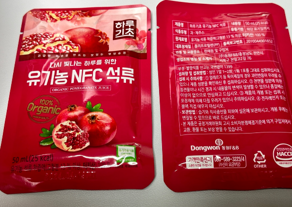 제품은 스타필드하남점에서 처음 만나 구입했으며 다시 빛나는 하루를 위한 유기농 NFC석류 제품이다. 30팩이 들어있고 가격은 5~6만 원이었다. 이따금 세일할 때 한번 구입했는데 맛도 먹기에 불편함이 없다고 해서 종종 샀다. 인터넷에서는 가끔 3만 원대에 팔고 있다. 이번에 그래서 3만 원에 구입하게 되었다.