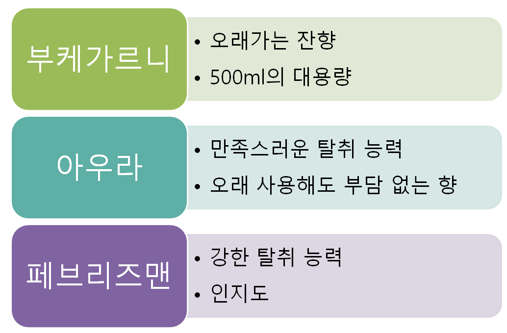 3가지 제품을 골고루 사용중이다. 페브리즈의 경우 고깃집 등 음식점냄새가 있을 때 강하게 탈취해 줘 다음날 나름 쾌적하게 입을 수 있는 환경을 만들어주고 있고, 아우라나 부케가르니의 경우 향을 선택하는 느낌으로 상의에는 은은한 아우라를 하의에는 부케가르니를 사용하는 식으로 쓰고 있다.