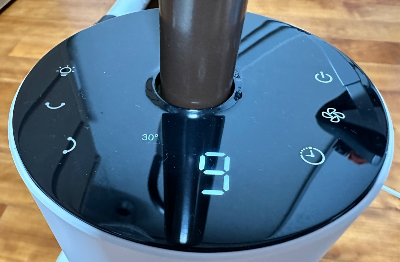 리모컨이 있어서 사용해도 되고, 본통 위에 터치식 스크린을 작동해도 된다. 직관적인 모양으로 되어있어 설명 없이도 잘 쓸 수 있다. 위에 숫자는 9단계이며 좌우각이 30도라는 표기이다.